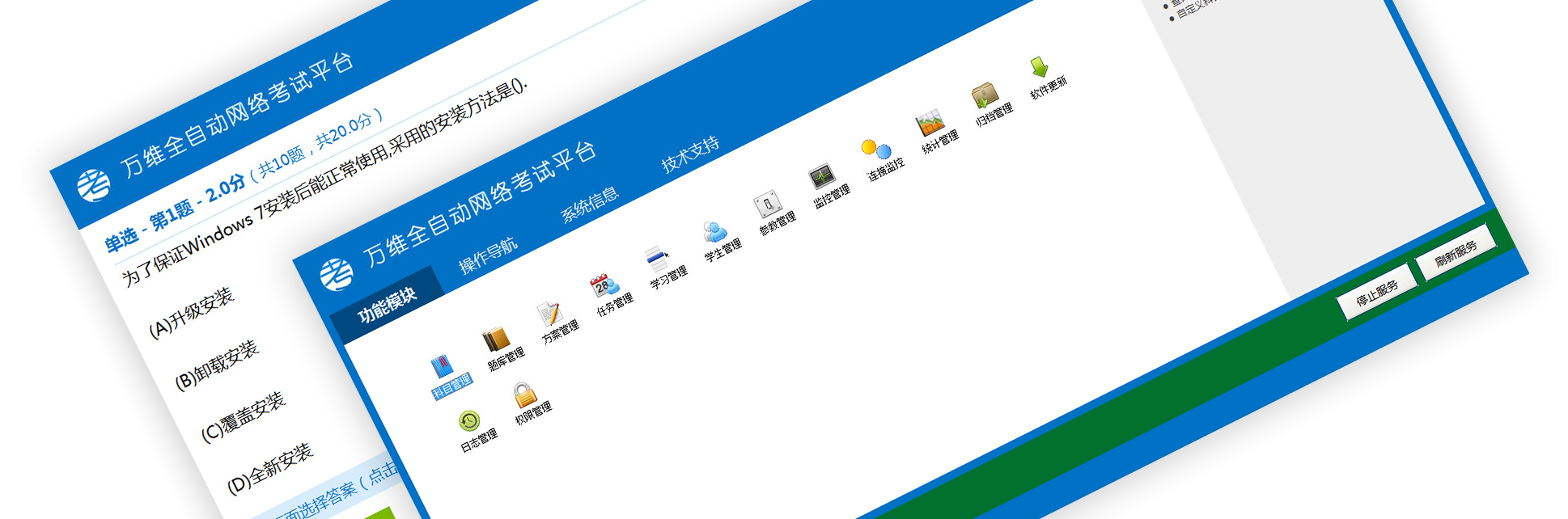万维全自动网络考试平台以识别准确、设计独到、安全可靠而成为国内全自动测评考试系统中的精品。使用万维全自动网络考试平台可以按照自身需求自由组织考试,测评考试结束后系统自动评分,即刻得到测评结果,形成详细的成绩分析报告,全面反映教学效果,为改进教学作参考。