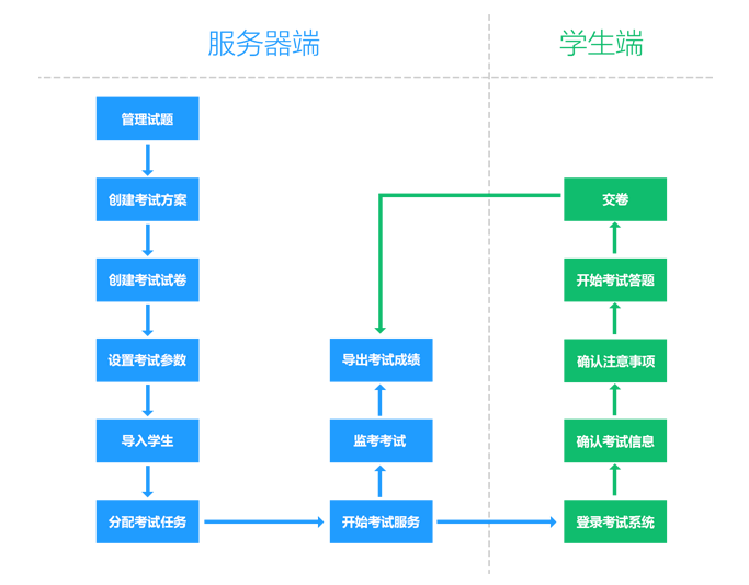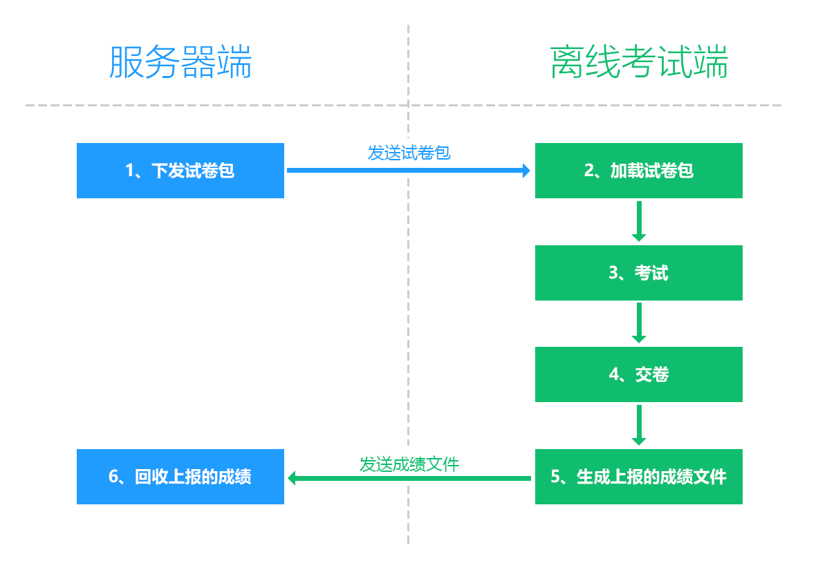 考试平台设计的架构方式是使用单台服务器来搭建C/S的两层数据处理模式,充分发挥单台服务器的性能,用最低的成本完成更多的任务。优点是,管理及维护成本低,对维护的管理人员的技术要求不高,可在不依赖软件技术支持的情况下,独自完成服务器及数据库管理工作;数据处理业务都在客户端机器进行,对数据库服务器的压力比较小,可同时支持的更多的并发点数,非常适用于考试平台这种对高并发要求较高的应用。如果满足不了客户端并发点数的要求,可采用多台服务器各自独立运行的方式,最后将数据进行整合来解决负载问题。