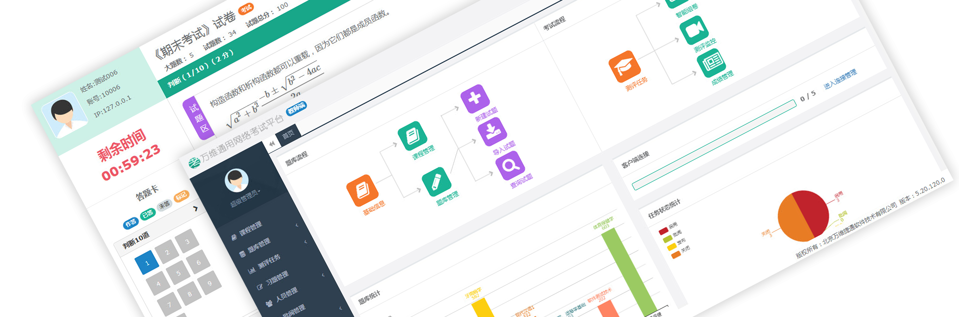 万维通用网络考试平台采用B/S架构设计,系统安全稳定、使用简单,适用于高校、企业、培训机构等单位的全学科的理论考核,提供练习、作业、测验、考试、实验等模式,能快速提高学生的学习实践能力,减轻教师繁重的教学负担,是教学与考试分离首选。